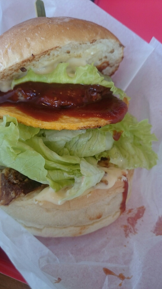 大きな口でがぶりついている写真やバーガーの大きさがわかるように顔と比較したりして皆さん写真撮ってました